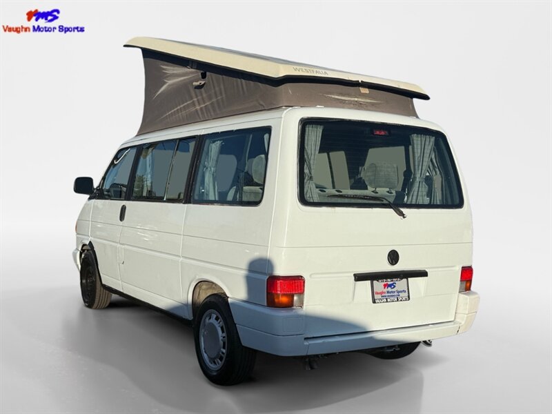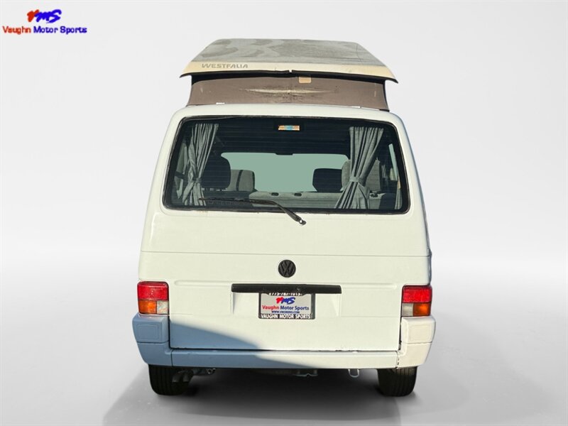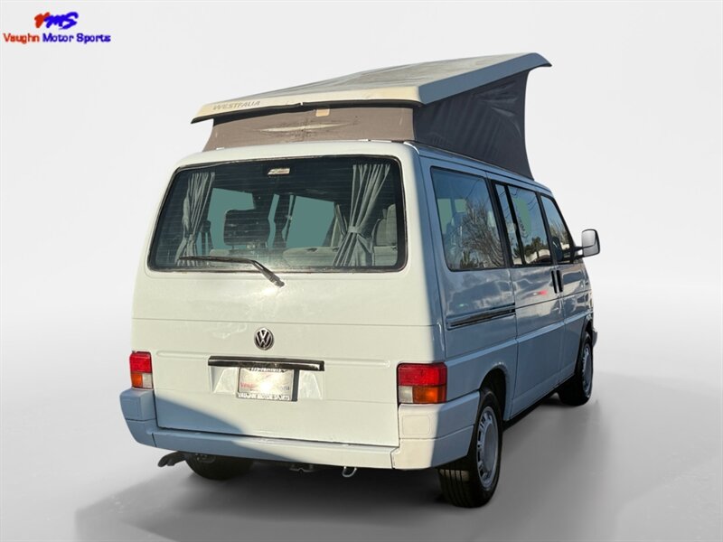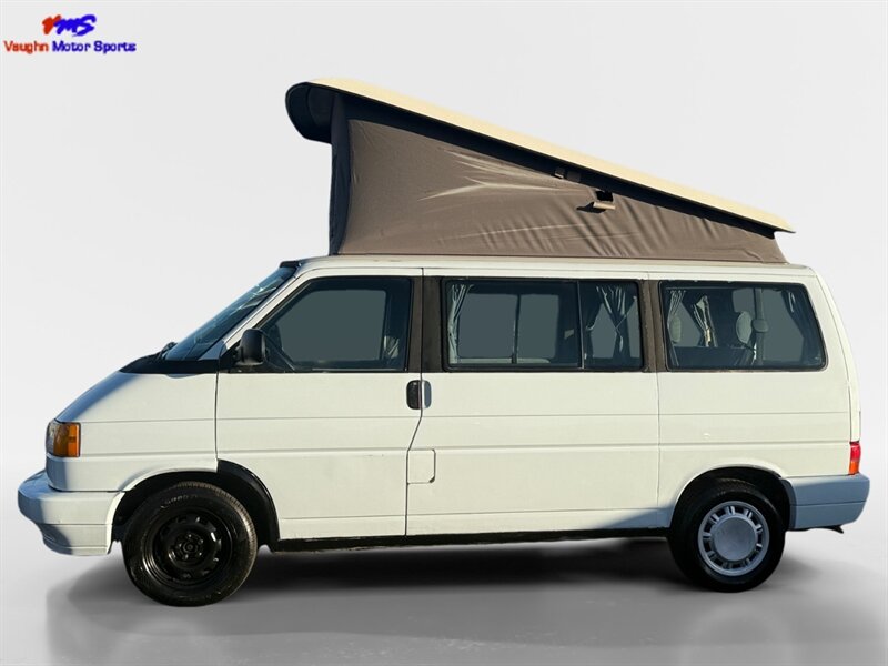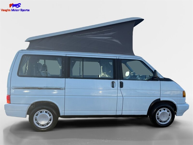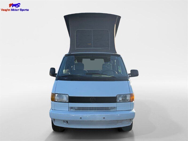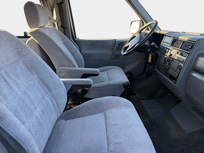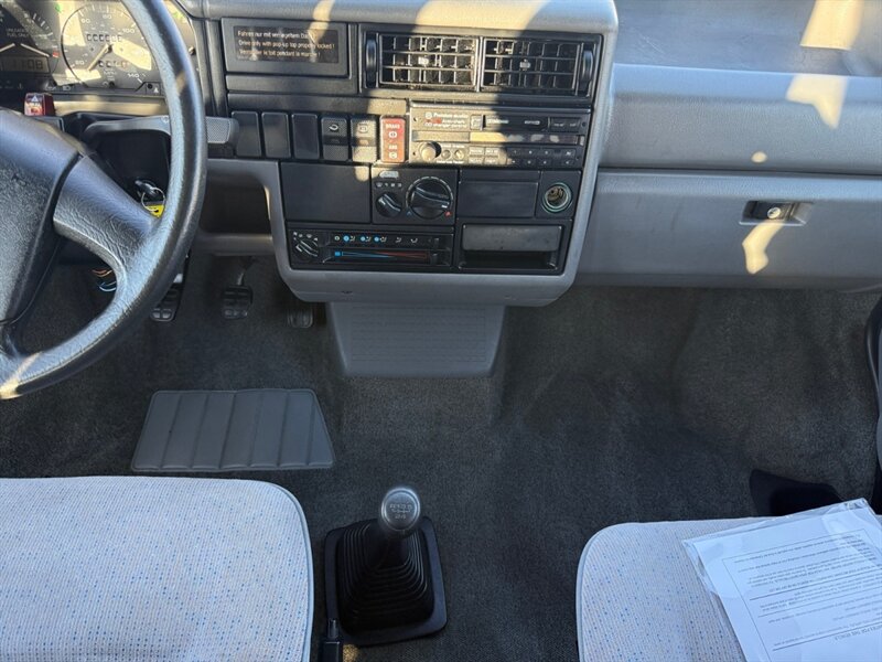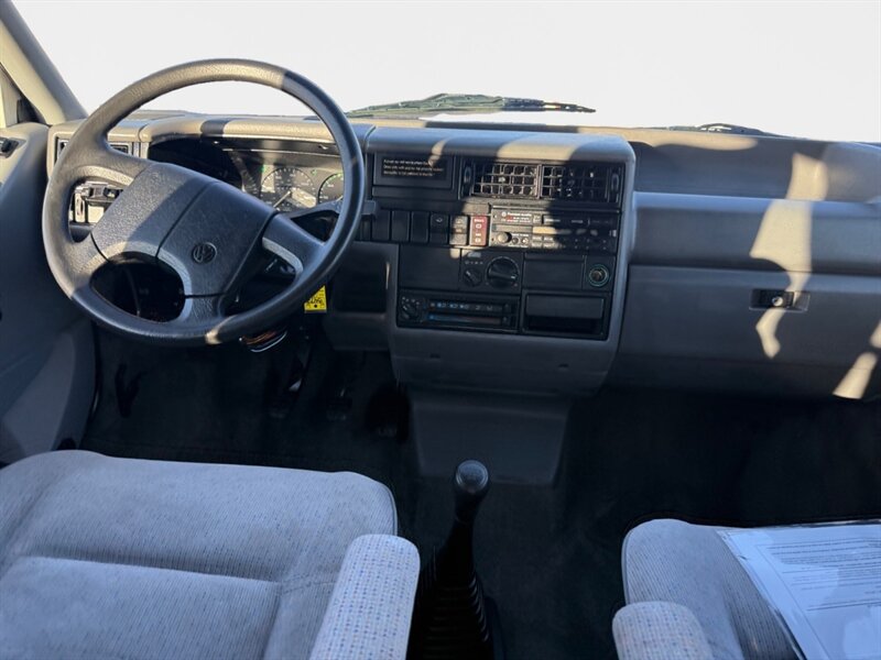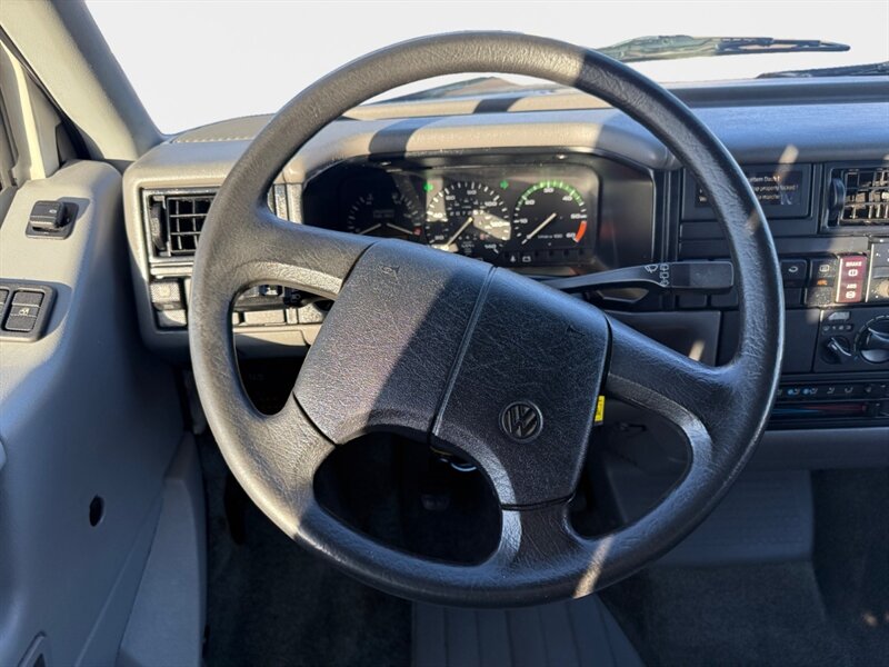 1993 Volkswagen EuroVan MV in White, powered by a 2.0L naturally aspirated inline-5 SOHC 10-valve engine. Factory equipment included air conditioning, power steering and power-assisted brakes, tilt steering column, AM/FM cassette stereo, intermittent windshield wipers, sliding side door and rear hatch with folding rear seating/bench configuration. Interior color not specified; vehicle shows under 208,000 miles (averaging less than 7,000 miles/year) and delivers about 15 MPG city / 20 MPG highway. Excellent overall condition with a clean CARFAX.