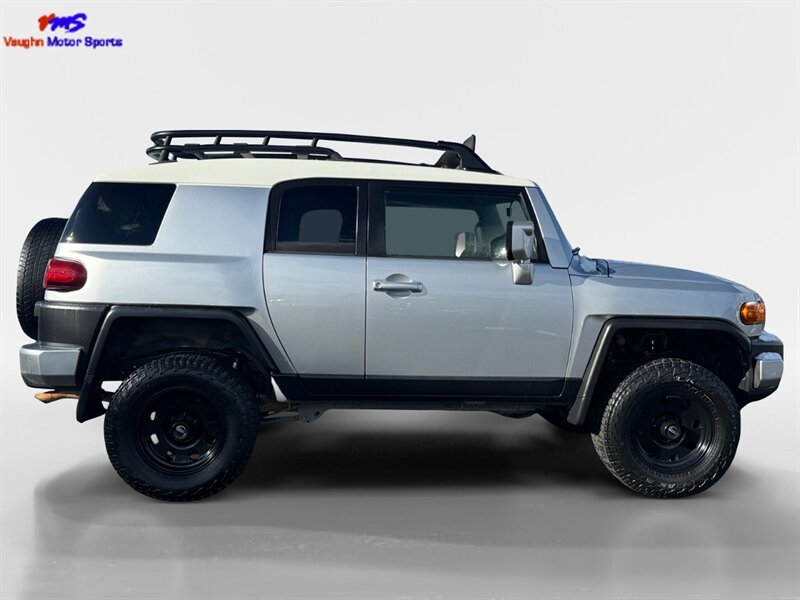 2008 Toyota FJ Cruiser in Silver, powered by a 4.0L V6 producing 239 hp and 278 ft-lb of torque. Factory-equipped with durable cloth seating (interior color/material not specified), air conditioning, cruise control, power windows and door locks, remote keyless entry, AM/FM/CD audio with auxiliary input, tilt steering, 17-inch alloy wheels, roof rack, rear swing-out access door with full-size spare, and rugged underbody protection. Standard safety and stability equipment includes ABS, stability and traction control, front and side-curtain airbags, and a tire pressure monitoring system. Fuel economy is approximately 16 MPG city and 20 MPG highway. Vehicle is in excellent overall condition with a clean CARFAX.