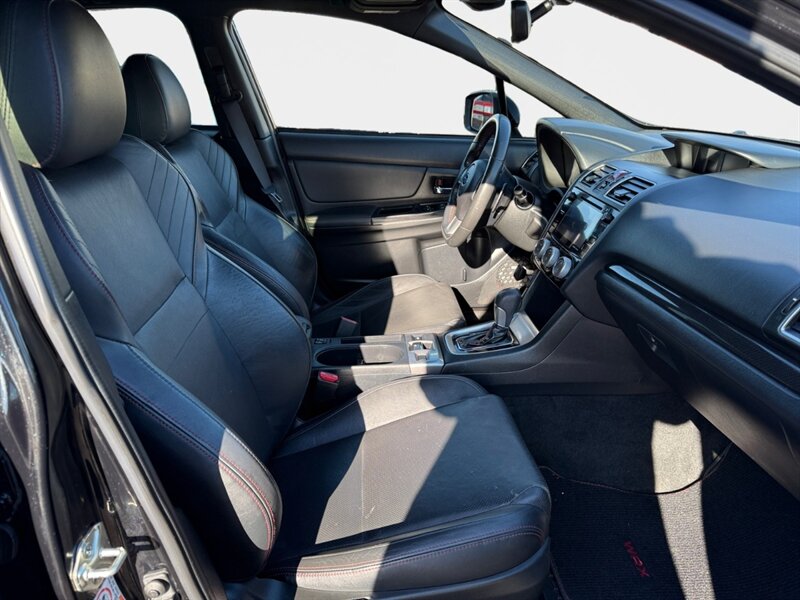 2017 Subaru WRX Limited powered by a 2.0L turbocharged H4 producing 268 hp and 258 ft. lbs. of torque, paired with Subaru’s Symmetrical All-Wheel Drive Automatic transmission. Factory equipment includes a sport-tuned suspension, leather-trimmed interior with heated front seats and a power-adjustable driver’s seat, keyless access with push-button start, automatic climate control, STARLINK infotainment with Bluetooth audio/phone integration and steering-wheel controls, rearview camera, 18-inch alloy wheels with fog lights, and standard safety systems including ABS, stability and traction control, multiple airbags, and tire-pressure monitoring. Finished in Crystal Black Silica with Black leather interior, this vehicle achieves 18 MPG city and 24 MPG highway, is in excellent overall condition, and has a clean CARFAX.