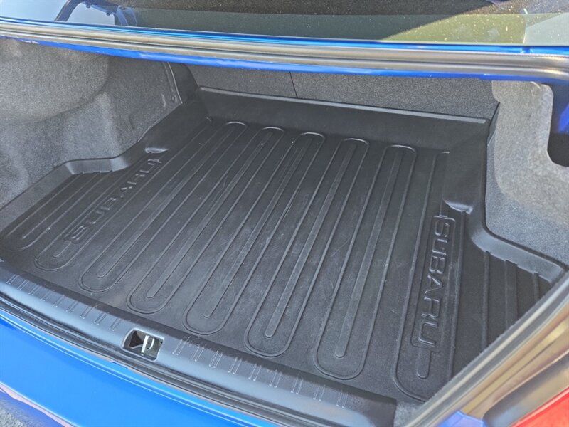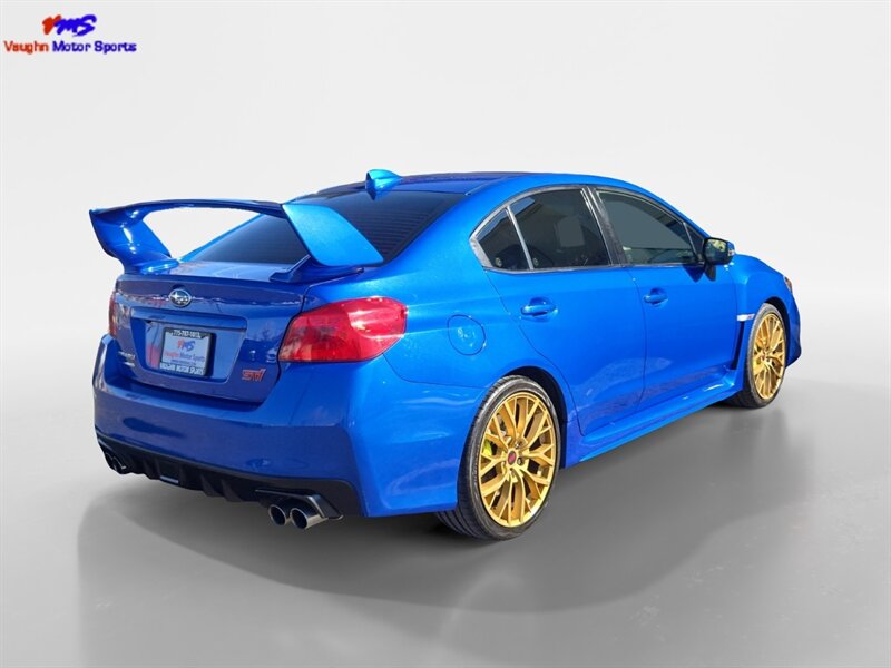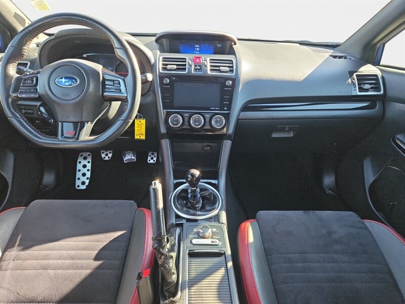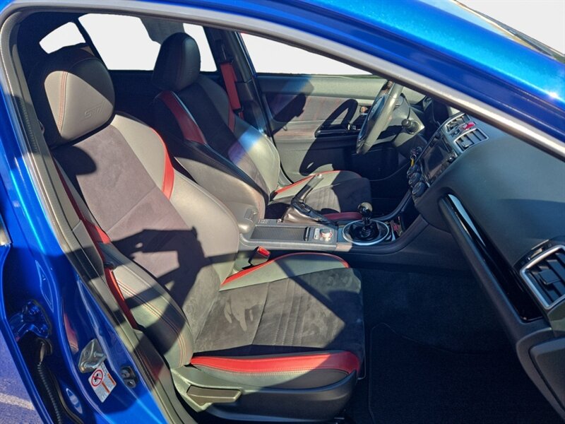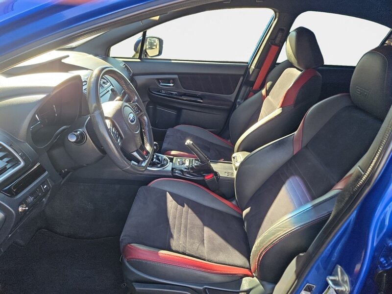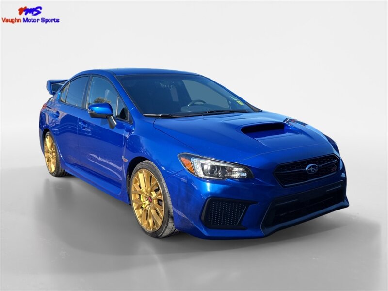 2018 Subaru WRX STI in Lapis Blue Pearl with Black/Carbon Black Alcantara and premium leather bolsters, powered by a 2.5L Turbo H4 producing 305 hp and 290 lb-ft of torque. Factory performance equipment includes Symmetrical All-Wheel Drive with a 6-speed manual and Driver Controlled Center Differential (DCCD), Brembo performance brakes, STI-tuned sport suspension, 18-inch alloy wheels, a prominent rear wing, and high-intensity headlights with fog lamps. Interior and convenience features from the factory include leather/Alcantara sport seats (heated), a leather-wrapped steering wheel and shifter, Subaru STARLINK infotainment with touchscreen and Bluetooth, rearview camera, dual-zone automatic climate control, keyless entry/push-button start, power windows/locks, and steering-wheel audio controls. This vehicle is in excellent overall condition, has a clean CARFAX, under 62,000 miles (averaging less than 7,000 miles/year), and EPA ratings of approximately 17 MPG city / 22 MPG highway.