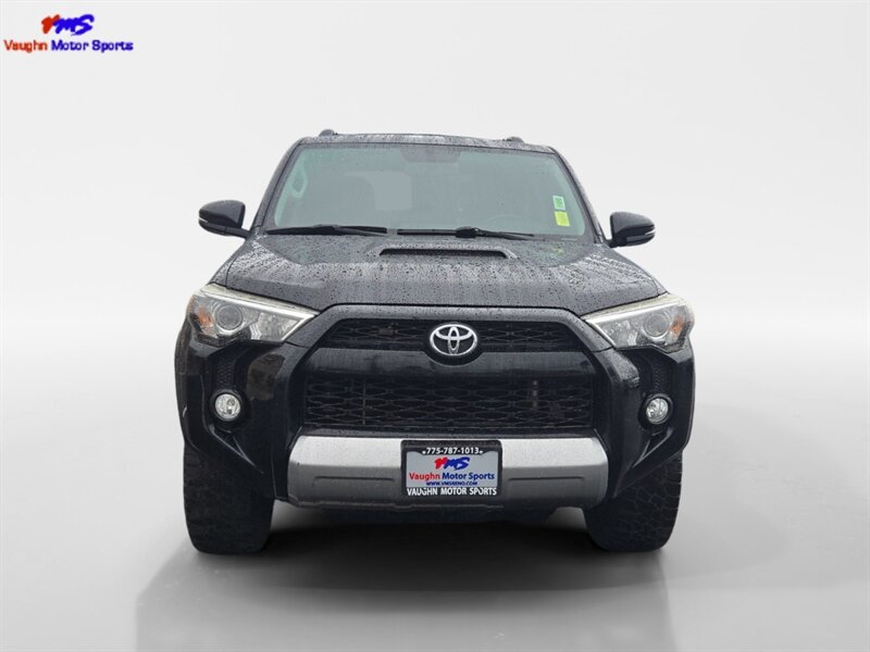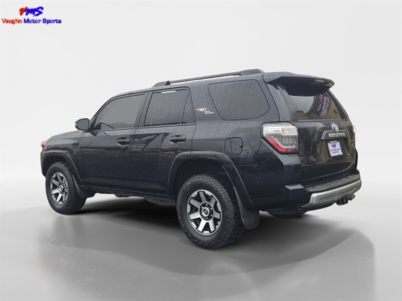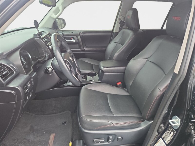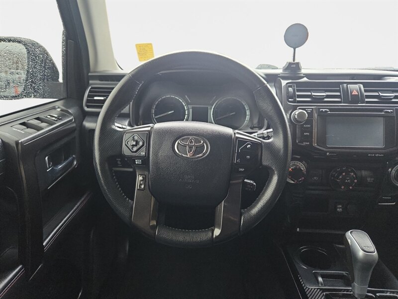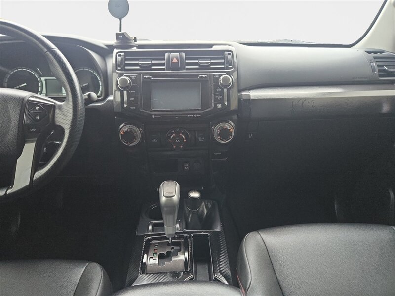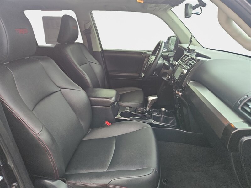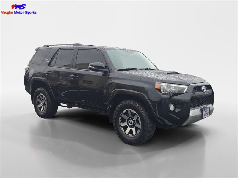 2019 Toyota 4Runner TRD Off-Road Premium in Midnight Black Metallic with Black leather interior. Powered by a 4.0L V6 producing 270 hp and 278 lb-ft of torque mated to a 5-speed automatic; EPA-rated at 17 MPG city and 20 MPG highway. Factory equipment includes part-time 4WD with locking rear differential, Multi-Terrain Select and CRAWL control, TRD-tuned suspension with Bilstein shocks, 17-inch alloy wheels, roof rails and power rear window; leather-trimmed heated front seats, power driver seat, dual-zone automatic climate control, Entune infotainment with Bluetooth and a rearview camera; and standard safety features such as ABS, stability and traction control and multiple airbags. Vehicle is in excellent overall condition with a clean CARFAX.